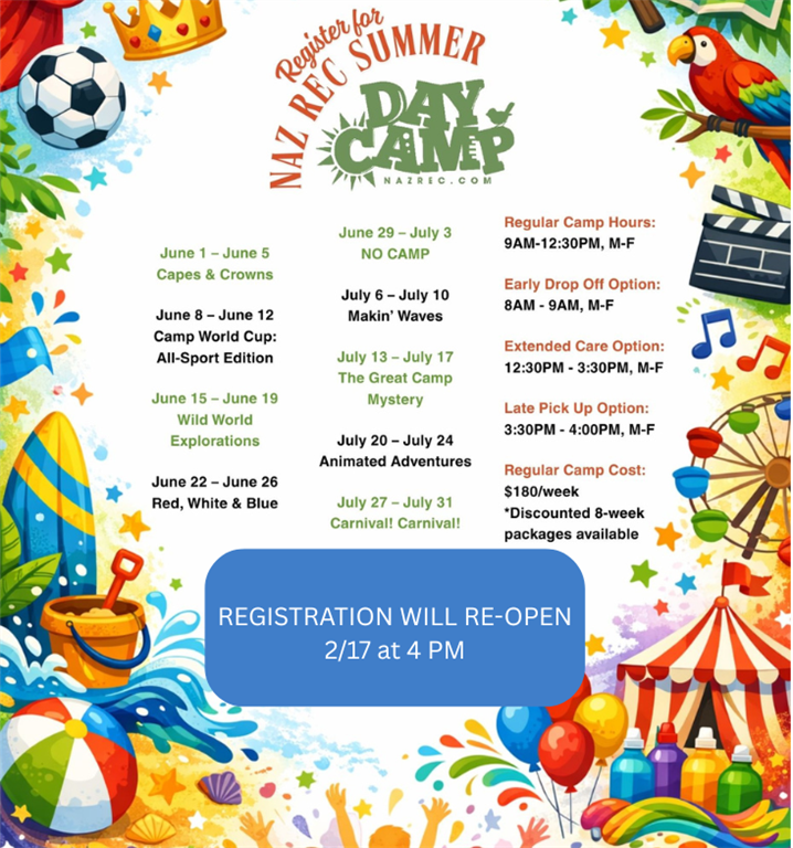 NazRec.com. If you do not see a receipt with camp registrations for 2026 in your invoice history, your registration has not been processed.